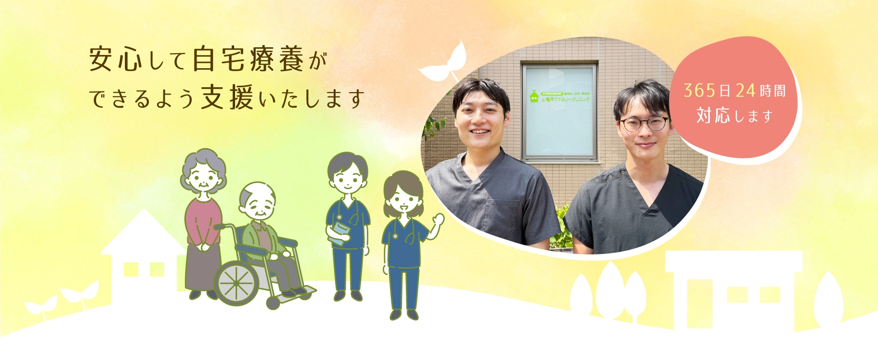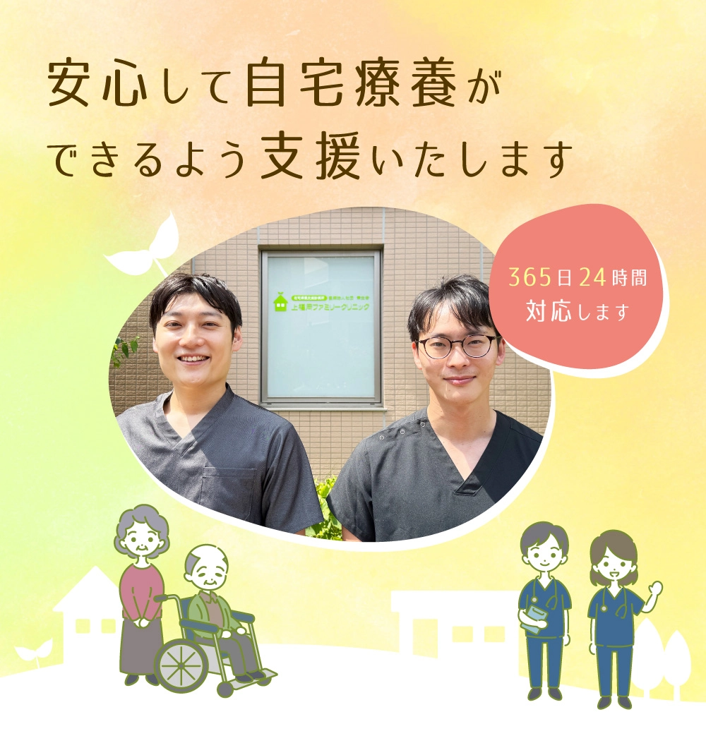 当クリニックでは、患者様とご家族が最良の選択をしていただけるよう、ご希望やお考えを丁寧に伺いながら診療を進めてまいります。病気に関することはもちろん、ご自宅での生活における困りごとなども、お気軽にご相談いただけるような、温かく寄り添う診療を目指しております。皆様が住み慣れた環境で安心した生活を送れるよう努めてまいりますのでどうぞよろしくお願いいたします。